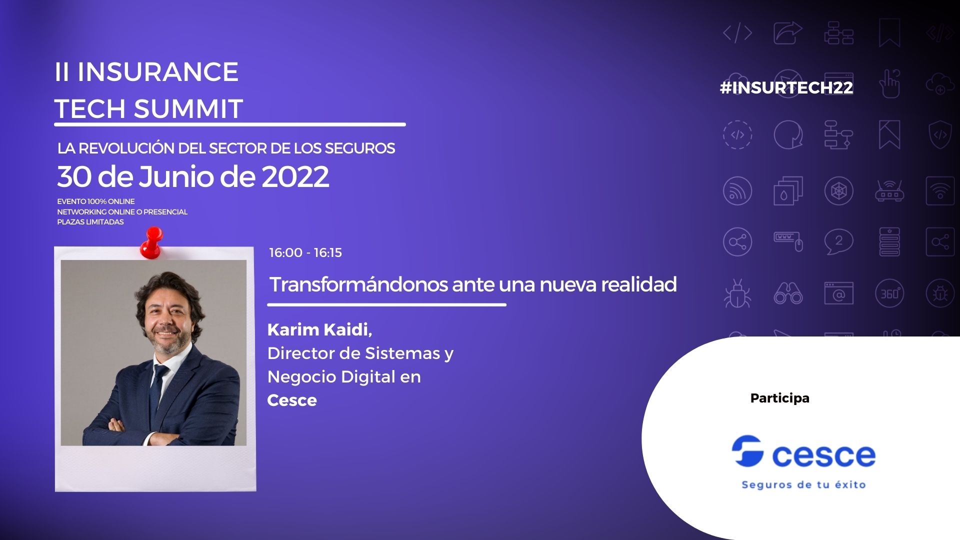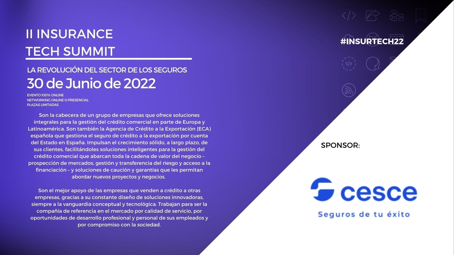 El próximo jueves 30 de junio tendrá lugar la 2º edición INSURANCE TECH SUMMIT 2022, 100% online, y que cuenta con el patrocinio de Cesce. Este es el encuentro profesional anual por excelencia sobre transformación digital para la industria aseguradora.