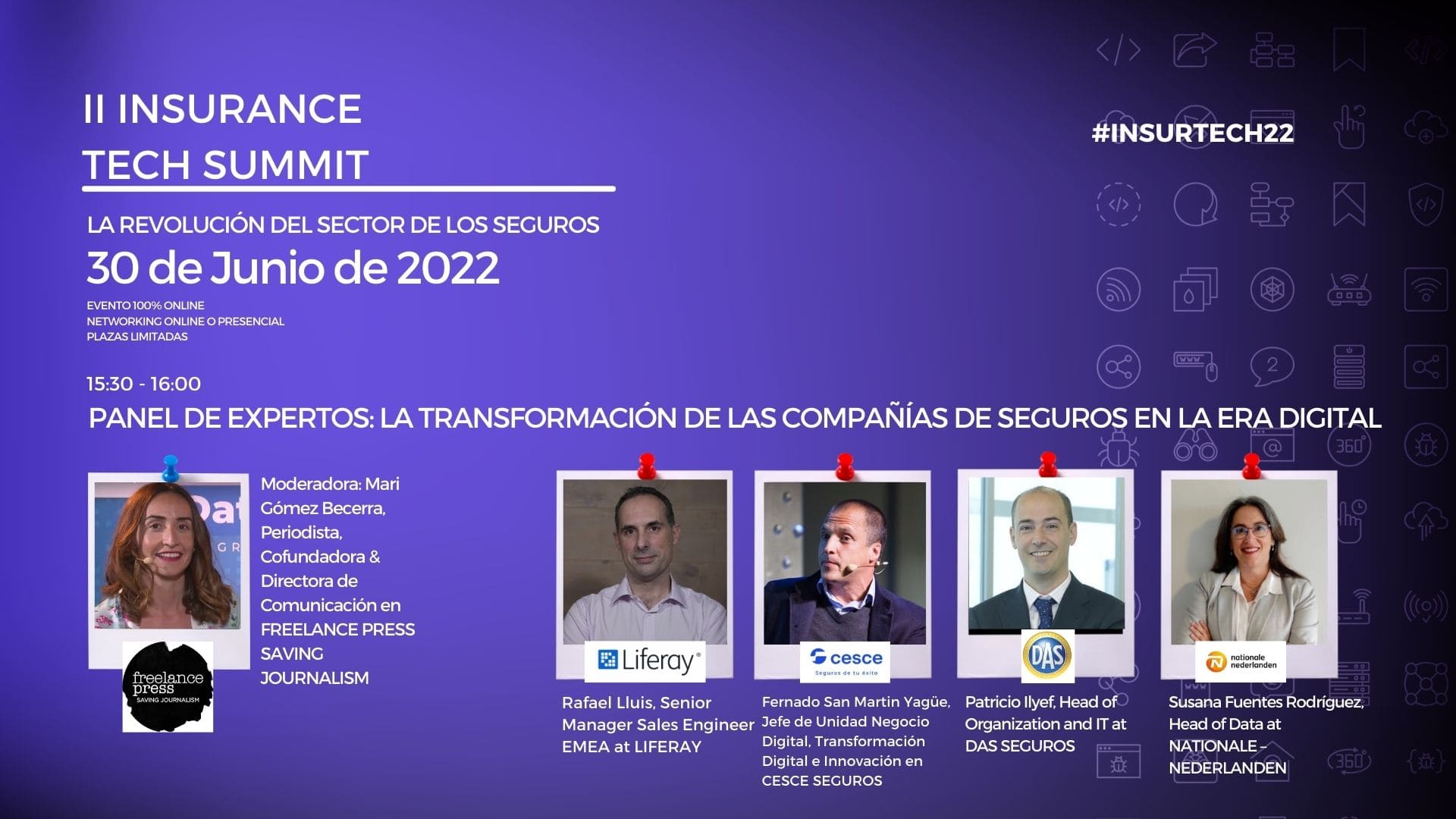 El evento organizado por Urban Evento Marketing Agency, contará con la participación destacada de expertos de la industria como David Navarro, CEO de y representante del vertical de InsurTech de AEFI; Karim Kaidi, Director de Sistemas y Negocio Digital y Fernado San Martin Yagüe, Jefe de Unidad Negocio Digital, Transformación Digital e Innovación en Cesce; Patricio Ilyef, Head of Organization and IT at DAS SEGUROS; Susana Fuentes Rodríguez, Head of Data at NATIONALE-NEDERLADEN; Alfredo Moya, Enterprise Account Executive en ENREACH; Iván Jiménez, Head of Innovation at MUTUALIDAD DE LA ABOGACIA ; Rafael Lluis, Senior Manager Sales Engineer EMEA at LIFERAY; Elena Martínez González, Digital Business Manager at EMERGYA, y Jaime Márquez Poo, Director ejecutivo de Desarrollo de Negocios en STP.