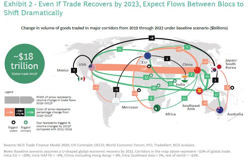 Nikolaus Lang y Ben Aylor encabezan un equipo de Boston Consulting Group que describe ciertas líneas esenciales, los primeros trazos, de lo que será un nuevo paisaje del comercio global, que irá tomando una dimensión más precisa a medida que se consolide el esperado despegue de la actividad, a la espera de recibir el permiso de lanzamiento, una vez han aparecido ya las primeras vacunas con altos grados de eficacia. El estudio cita un descenso del 20% del comercio global en 2020 en un escenario base de recuperación económica en el que sitúa en 2023 el ejercicio en el que las transacciones comerciales del planeta volverán a registrar los 18 billones de dólares a los que llegó el volumen de negocio de los intercambios de bienes y mercancías en 2019. En su versión más optimista, con un despegue de la actividad fulgurante tras la Gran Pandemia, que debería fraguarse en este primer trimestre de 2021, toda vez que en el último tramo de 2020 la segunda oleada de contagios volvió a contraer la coyuntura de las potencias industrializadas y de buena parte de los mercados emergentes, el retorno a los niveles comerciales previos a la crisis sanitaria podría apreciarse ya este ejercicio. Aun así, el panorama de la globalización comercial -dicen desde BCG- “es dramáticamente diferente con las compañías con vocación de internacionalización todavía luchando por hacerse un hueco en el escenario post-Covid”. Dentro de un contexto de “economías desestabilizadas, intensas fricciones geopolíticas y una elevada exposición al riesgo en el suministro de manufacturas globales y de redes de infraestructuras y de transporte y en la reconversión digital y de transformación de sus cadenas productivas y de valor”. Todo ello, explican, induce a anticipar en un “rediseño del mapa del comercio mundial”. Sus autores dejan dos gráficos que ayudan a entender la dimensión de los cambios en ciernes. Una transformación en estado latente. El primero, muestra las pasarelas comerciales de mayor intensidad de tráfico entre 2015 y 2019. Mientras que el segundo, ahonda en los nuevos pasillos prioritarios que emergerán en el próximo trienio, hasta 2023, a partir de sus cálculos base.