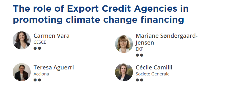 En el taller “The role of Export Credit Agencies in promoting climate change financing”, moderado por Carmen Vara, directora de Operaciones por cuenta del Estado de CESCE, han participado Teresa Aguerri, directora de la división de Export Finance de Acciona; Mariane Søndergaard-Jensen, directora de Relaciones Internacionales de EKF (Dinamarca), y Cécile Camilli, subdirectora global de Export Finance de Societe Generale (Francia).