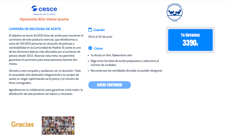 Cesce se ha sumado un año más a la operación kilo del Banco de Alimentos de Madrid del 6 al 20 de junio. El objetivo de la campaña de este año ha sido asegurar el suministro de aceite, reuniendo 65.000 litros.