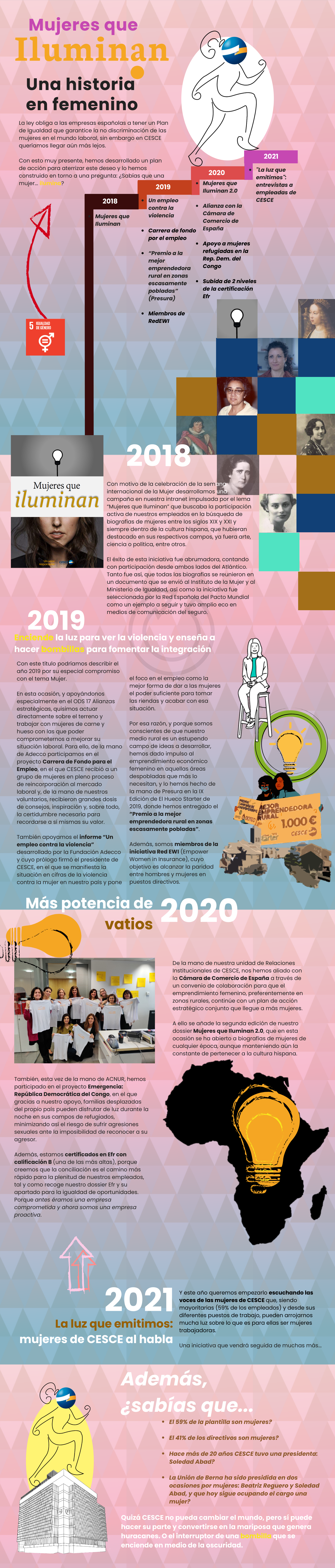 Para ello, hemos desarrollado una infografía que recoja nuestras acciones y proyectos a lo largo de los últimos cuatro años, todo ello aunado bajo el título “Mujeres que iluminan: una historia en femenino”. En ella cada proyecto, ordenado de manera cronológica, muestra la continuidad de cada iniciativa y su crecimiento exponencial tanto dentro de la compañía como a través de múltiples alianzas con diferentes grupos y entidades.