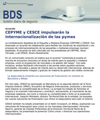 CEPYME y CESCE han alcanzado un acuerdo de colaboración para facilitar las iniciativas de exportación y los procesos de internacionalización de las PyMEs españolas. En un comunicado conjunto se explica que el acuerdo ?contempla la puesta en marcha de proyectos conjuntos en áreas de interés como la prospección de mercados o la gestión del riesgo?. Con esta iniciativa se facilitará información a las PyMEs sobre sectores, actividades, países y mercados de su interés, además de brindar asesoramiento integral y gratuito en materia de gestión del crédito comercial.