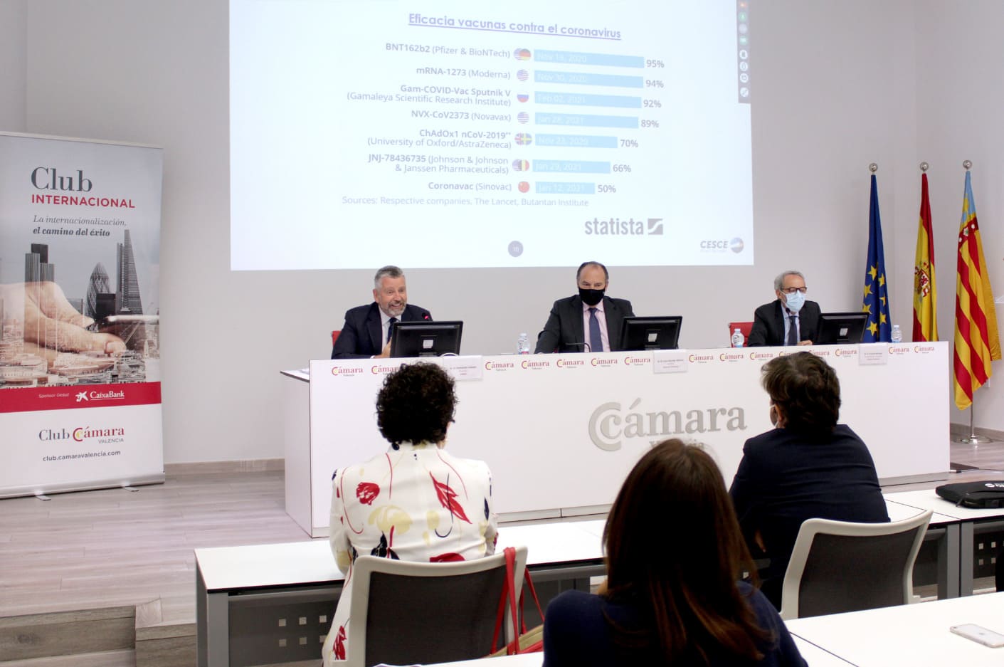 Valencia, 2 de junio de 2021.- “Detrás de la pandemia va a emerger un boom económico, una intensa recuperación en “V” que será desigual y la clave de esa recuperación va a ser la vacunación”. Así lo ha asegurado el presidente de CESCE, Fernando Salazar, en el seminario sobre la evolución del comercio internacional “Perspectivas de recuperación y dinamismo post-COVID19”, organizado por el Club Internacional de Cámara Valencia, y dirigido a empresas exportadoras y con potencial exportador. El encuentro, moderado por el coordinador del Departamento Internacional de Cámara Valencia, Vicente Mompó, ha sido un coloquio en el que han participado el presidente de la aseguradora y el de Cámara Valencia, José Vicente Morata.
